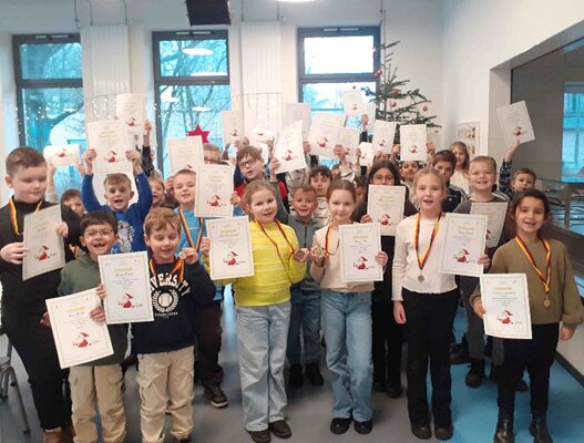 Platz Asarja 4a / 2. Platz David 4a / 3. Platz Elias 4b / Bestes Mädchen Mila 4a / beste 2-Klässlerin Nelli 2b / bester 2-Klässler Damian 2a / beste 1-Klässlerin Lisa 1b und bester 1-Klässler Maxim 1b.